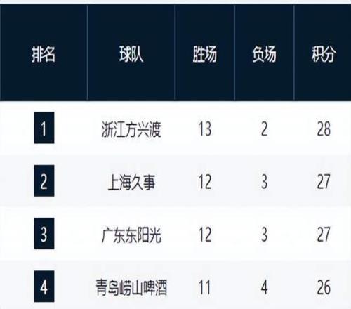 积分榜前三名依旧由广厦、上海和广东三队把持。卫冕冠军广厦队凭借一波4连胜,以13胜2负的战绩独占鳌头,领先广东队1个胜场。上海队以12胜3负的战绩紧随其后,位列第2名。广东队则在上一轮40分惨败给上海队后,战绩同为12胜3负,但因交锋战绩劣势暂居第3名。