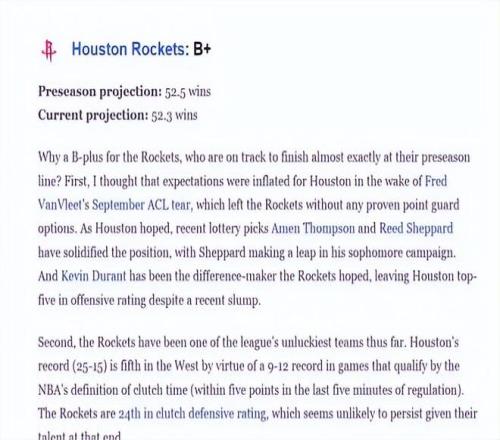 针对这样一份半程战绩,今日美媒ESPN给火箭打出了B+的高分。