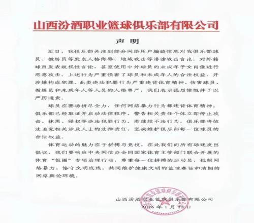 1月25日晚间,山西汾酒职业篮球俱乐部发布声明称,球队球员、教练和球员的未成年子女遭到部分网络用户的恶意攻击和侮辱,球队已经启动法律程序,依法追责。